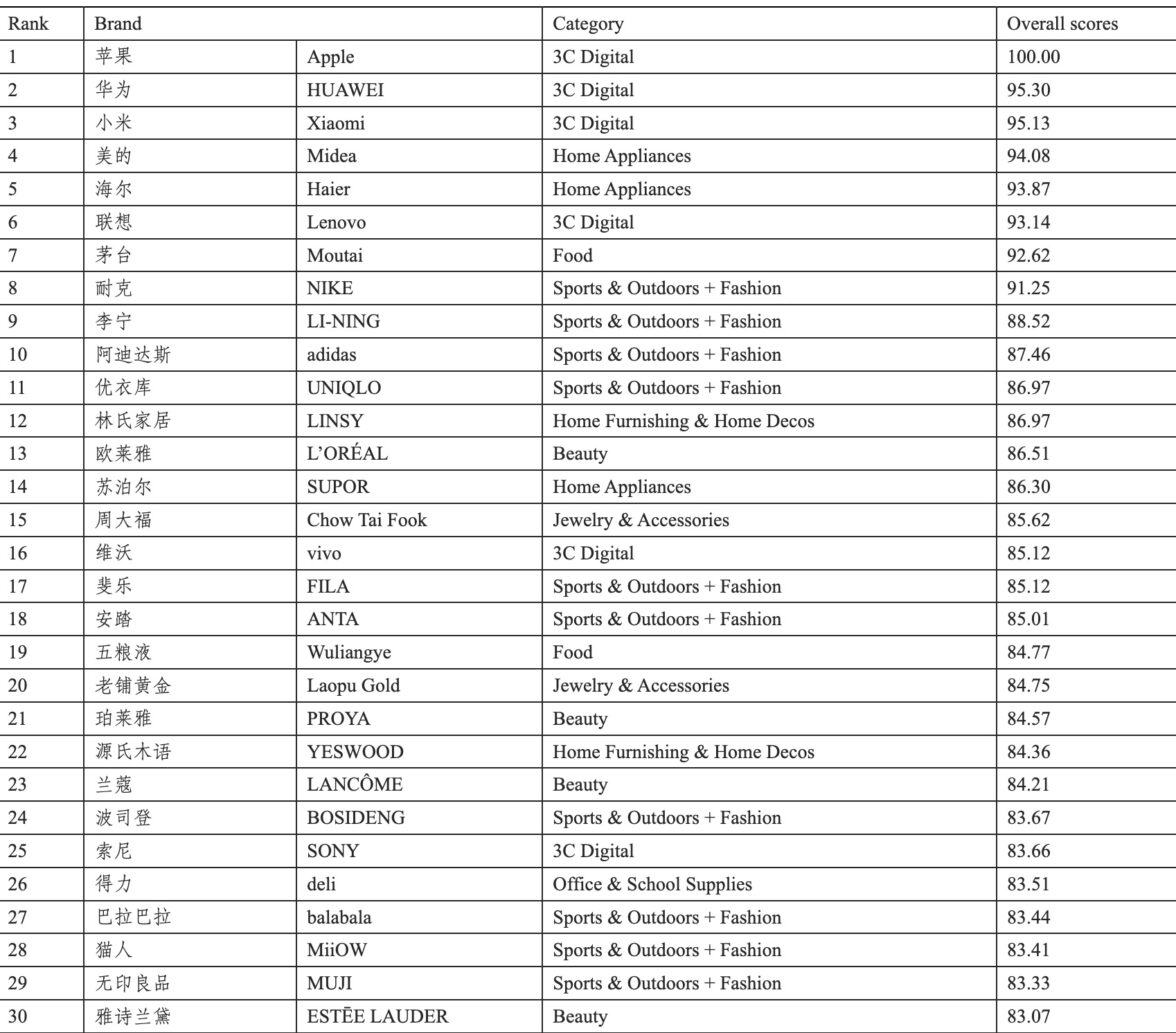 Максимально возможный балл — 100. Такой балл получил бренд, возглавивший рейтинг — Apple. Второе и третье места в списке достались также компаниям, работающим в категории 3C Digital (компьютеры, средства связи, бытовая электроника) — Huawei (95,4 балла) и Xiaomi (95,13). Следующие две строчки заняли китайские бренды бытовой техники — Midea (94,08) и Haier (93,87). Мировой лидер по объему продаж персональных компьютеров Lenovo, также представляющий Китай — на шестой строчке (93,14). Moutai, бренд традиционной китайской водки — седьмой (92,62). Первую десятку замыкают производители спортивной одежды и обуви — Nike (США, 91,25), Li-ning (Китай, 88,52) и Adidas (Германия, 87,46).
