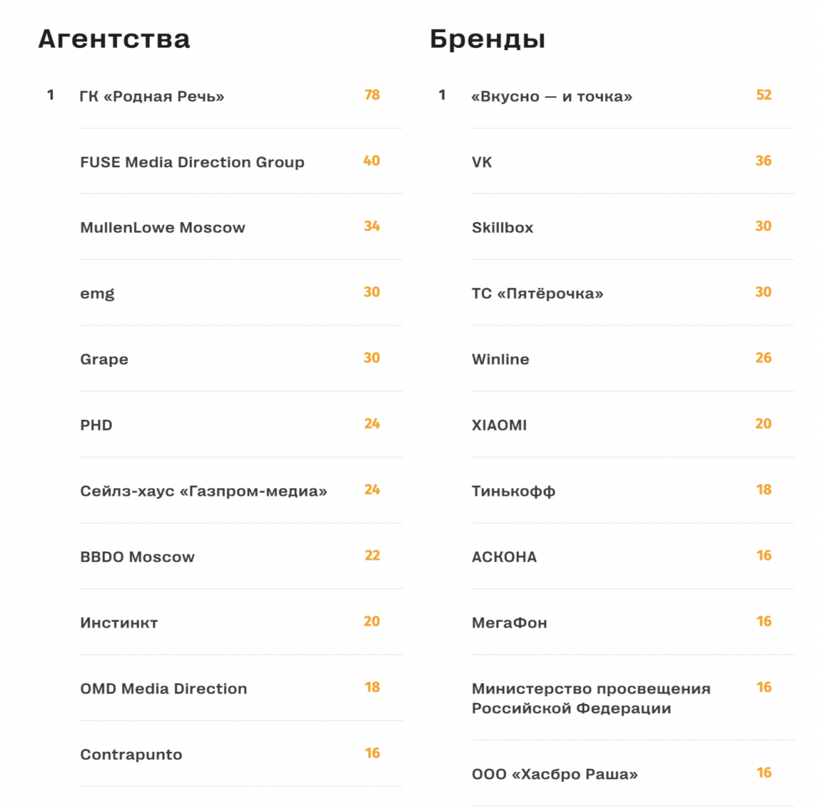 В десятку лучших с точки зрения эффективности маркетинговых кампаний вошли Winline, XIAOMI, Тинькофф, АСКОНА, МегаФон, Министерство просвещения Российской Федерации, ООО «Хасбро Раша», АО «Тандер». Среди агентств — emg, Grape, PHD, Сейлз-хаус «Газпром-медиа, BBDO Moscow, Инстинкт.