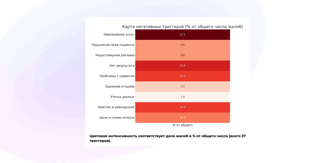 Та же часть негативных отзывов которая исходила от реальных клиентов клиники в основном была направлена не на врачей или сервис клиники, а на некорректную рекламу. Маркетологи клиники, пытаясь привлечь больше клиентов, переборщили с креативом: пообещали «суперакцию», которая в реальности действовала не так, как ожидал человек. В итоге пациенты чувствовали себя обманутыми — и шли писать гневные отзывы.