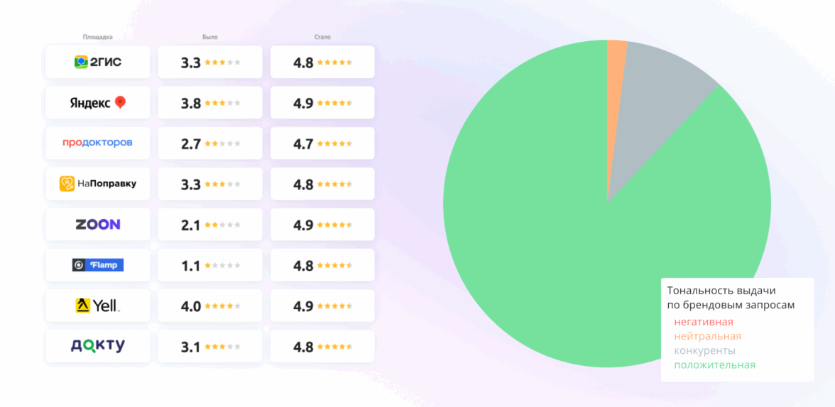 Но, пожалуй, главной победой стали не цифры, а возвращенное доверие. Шаг за шагом, мы превратили токсичную выдачу с рейтингом 2.9 в устойчивую систему привлечения пациентов. То есть клиника не просто «подчистила репутацию» — она вернула себе доверие. А вместе с доверием — и приток новых пациентов.
