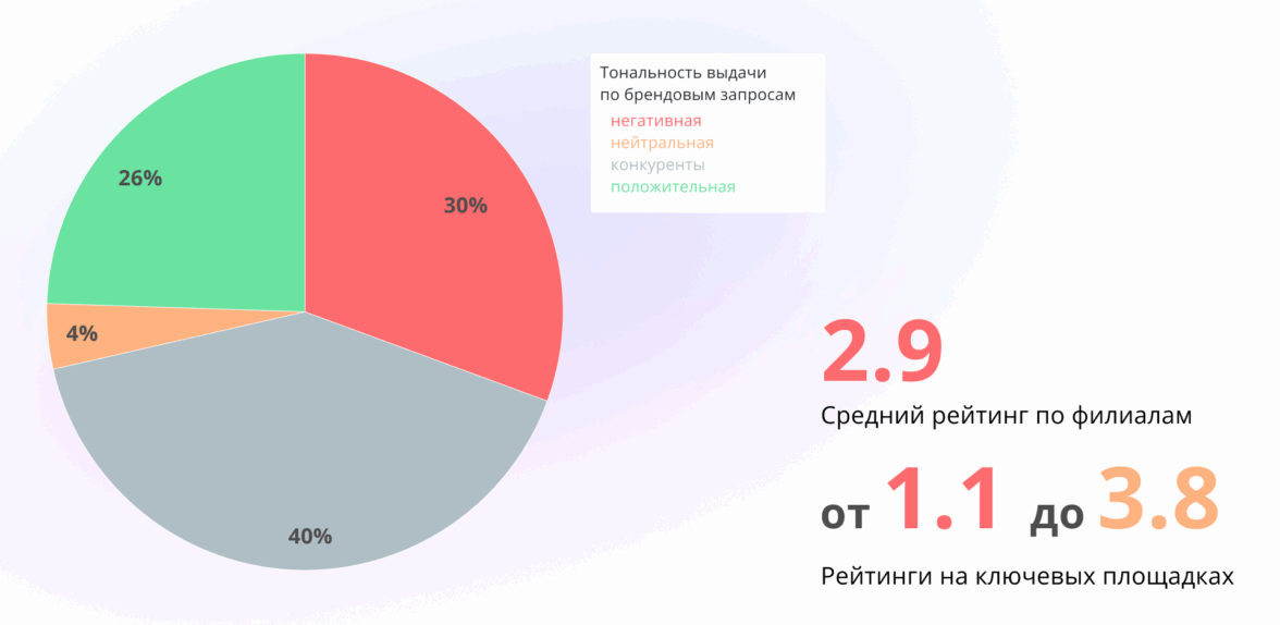 Первое, с чего мы начали — это настройка ежедневного мониторинга упоминаний в поиске и на отзовиках. Мы сформировали список всех карточек компании во всех регионах присутствия. Объединили карточки в единую сеть для контроля и централизованного управления. Провели детальный анализ негативных триггеров и причин возникновения негатива. Причём не просто в целом, а с учётом региональной выдачи по всем 30 городам.