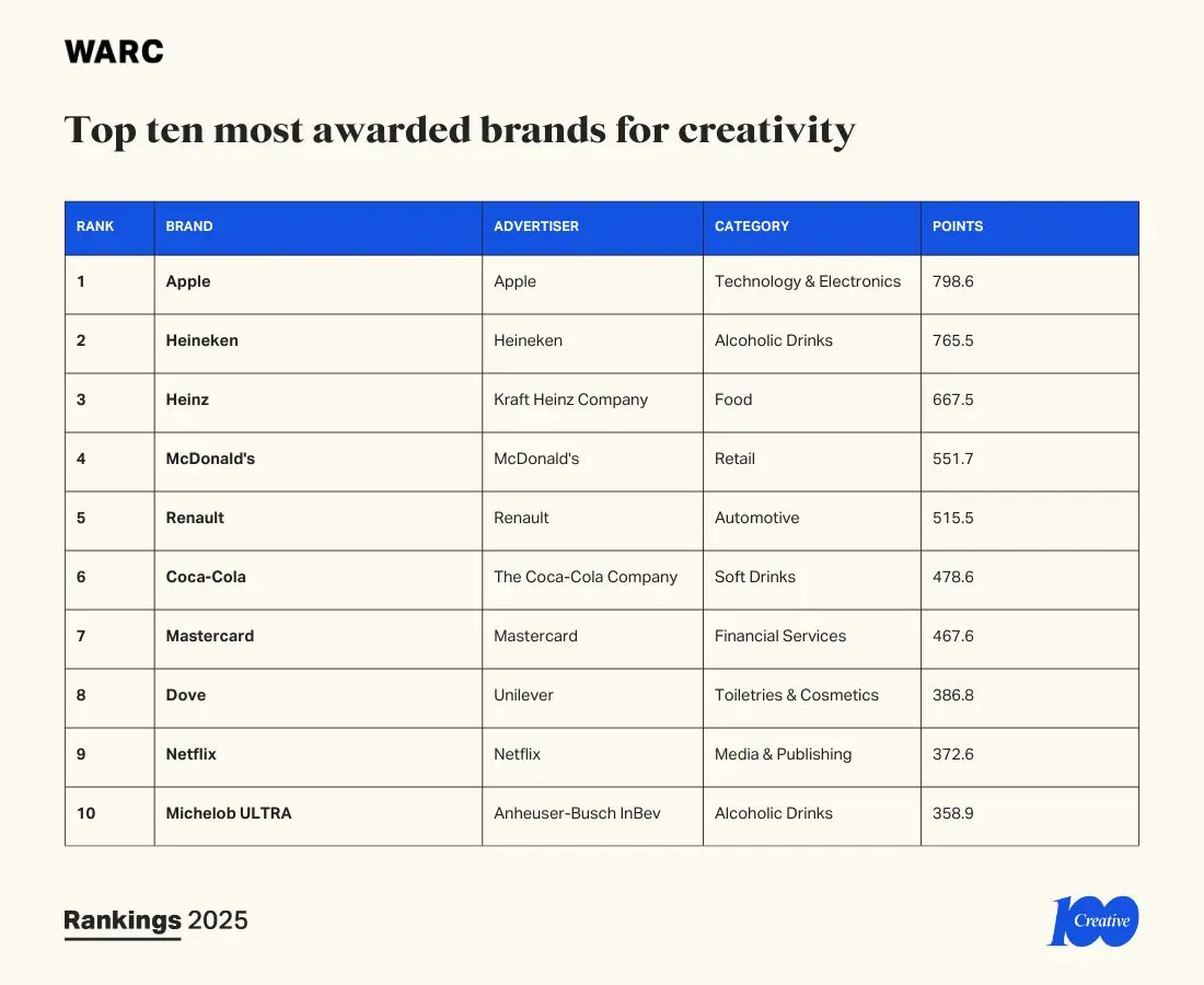 WARC представил самый уважаемый мировой рейтинг креативности за полный 2024 год и часть 2025-го. Самым креативным агентством стал парижский Publicis, а рекламной группой — британская WPP. Лидерство в рейтинге брендов возглавили Apple, Heineken и Heinz, оттеснив прошлогоднего лидера, пиво Michelob от AB InBev на десятую строчку. Подробности и лучшие рекламные ролики 2024-2025 — в материале ADPASS.