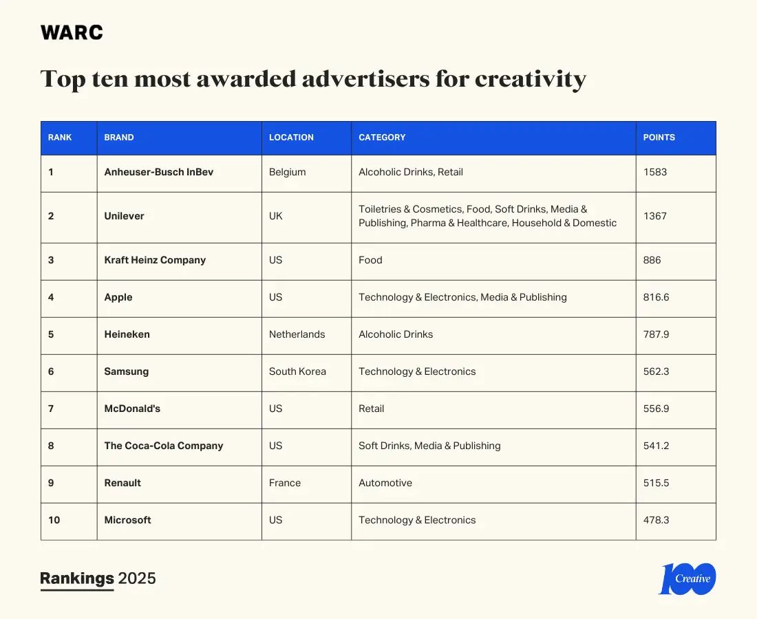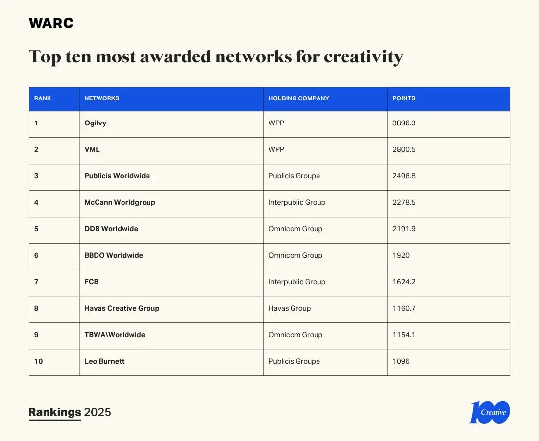 Всемирный центр рекламных исследований (WARC) опубликовал рейтинг лучших мировых рекламных агентств, групп, рекламодателей и кампаний, получивших самое высокое количество наград на мировых фестивалях в 2024-2025 годах.