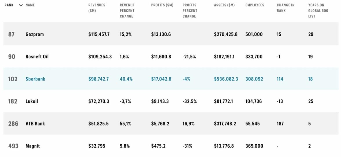 В топ-500 мирового бизнеса по выручке вошли шесть российских компаний. «Газпром» поднялся по сравнению с прошлым годом на 15 позиций и занял 87-ю строчку рейтинга. «Роснефть» опустилась на одну строчку — с 89-го места на 90-е. Сбербанк совершил мощный подъем — на 114 позиций — и закрепился на 102-м месте. «Лукойл» опустился с 169-й на 182-ю строчку. Банк ВТБ показал даже более мощный рост, чем Nvidia, взлетев с прошлогоднего 473-го места на 286-е. Сеть розничных магазинов «Магнит» в этом году заняла 493-ю позицию, в прошлом году в рейтинге ее не было.