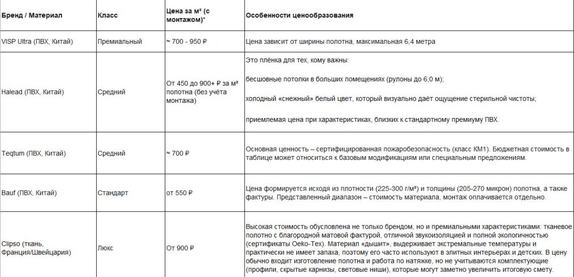 Таблица №2. VISP Ultra и другие популярные плёнки и ткани для натяжного потолка