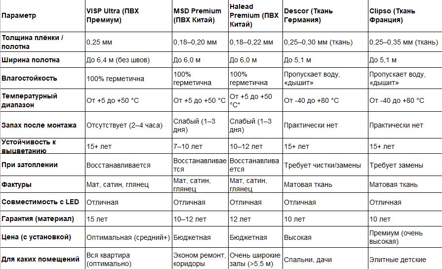 Ниже представлена сравнительная таблица, которая наглядно демонстрирует, почему плёнка VISP Ultra занимает лидирующие позиции в рейтинге материалов для натяжных потолков. В таблице сопоставлены ключевые параметры VISP Ultra, популярных китайских полотен Halead Premium, а также известных немецких брендов, но производящихся на территории Китая, Bauf, Teqtum и Clipso (Франция).