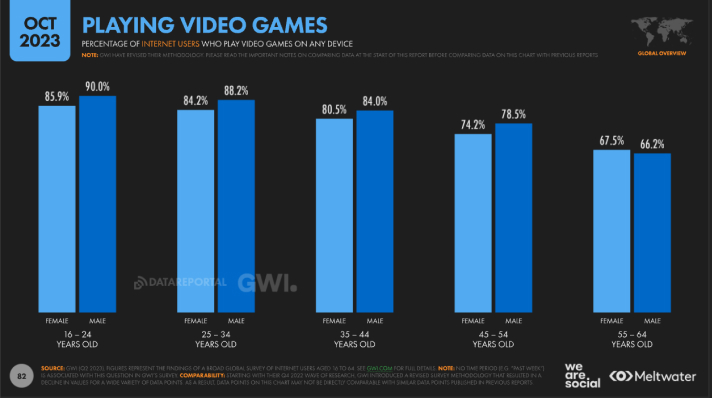 Тем не менее можно отметить четкую связь между возрастом и временем, затрачиваемым на видеоигры. Аудитория в возрасте 16–24 лет почти 90% свободного времени уделяет играм, в то время как люди в в возрасте 55–64 лет — примерно 65%.