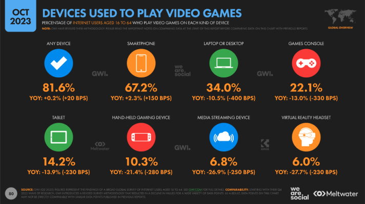 На сегодняшний день 81,6% пользователей по всему миру играют в видеоигры. Как и ожидалось, для этой цели они предпочитают использовать мобильные устройства (67.2%).