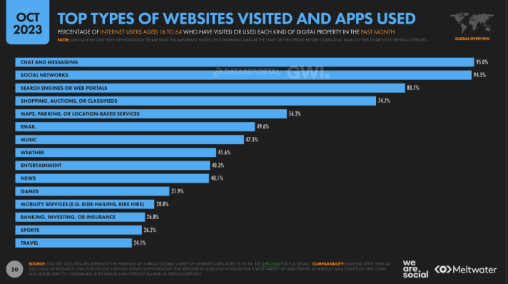 У сайтов и приложений есть собственная статистика, объясняющая причины их посещения. Лидирующей категорией остаются чаты и мессенджеры (95,0%). Далее по списку: