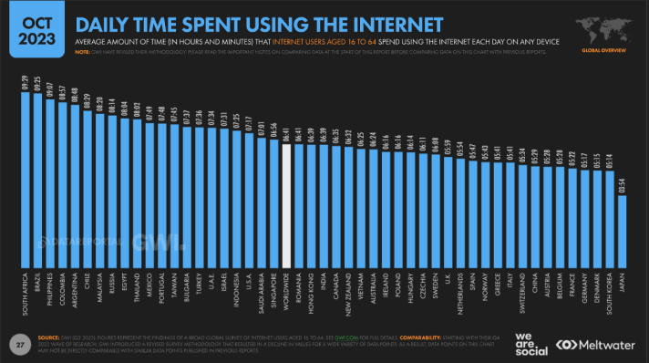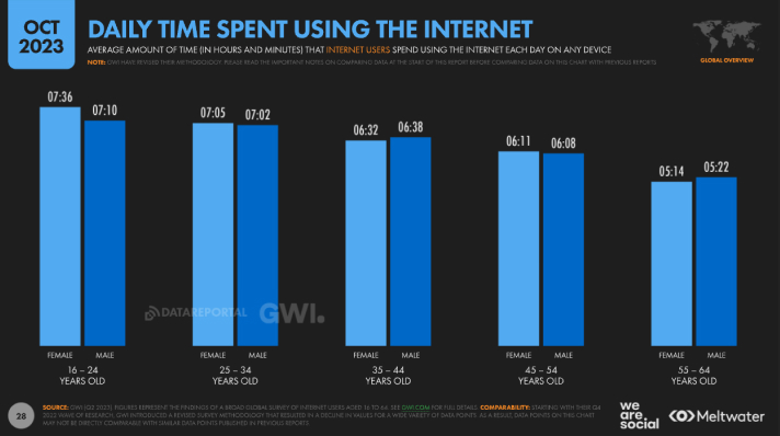 После уменьшения времени, проведенного в Интернете в начале 2023 года, замечен небольшой рост. Согласно последним данным GWI, за последние 12 месяцев типичный пользователь Интернета увеличил свою ежедневную онлайн-активность на 4 минуты.