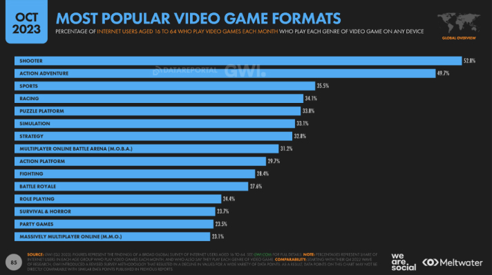 Самые популярные форматы среди аудитории 16–64 лет это шутер (52.8%) и приключенческий боевик (49.7%). Пользователи также любят гонки (34.1%), головоломки (33.8%) и стратегии (32.8%).