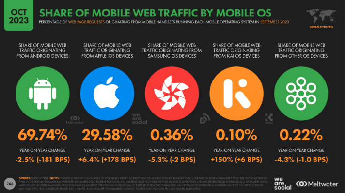 Если говорить про операционные системы, то среди них по прежнему преобладает Android (69.74%). Далее идут девайсы с IOS (29.58%), Samsung (0.36%) и KAI (0.10%).