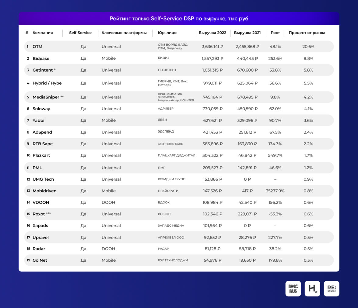 *данные по выручке предоставлены Гетинтент; ** Self-service DSP у MediaSniper в бете; ***У Roxot DSP появилось в октябре 2022 года