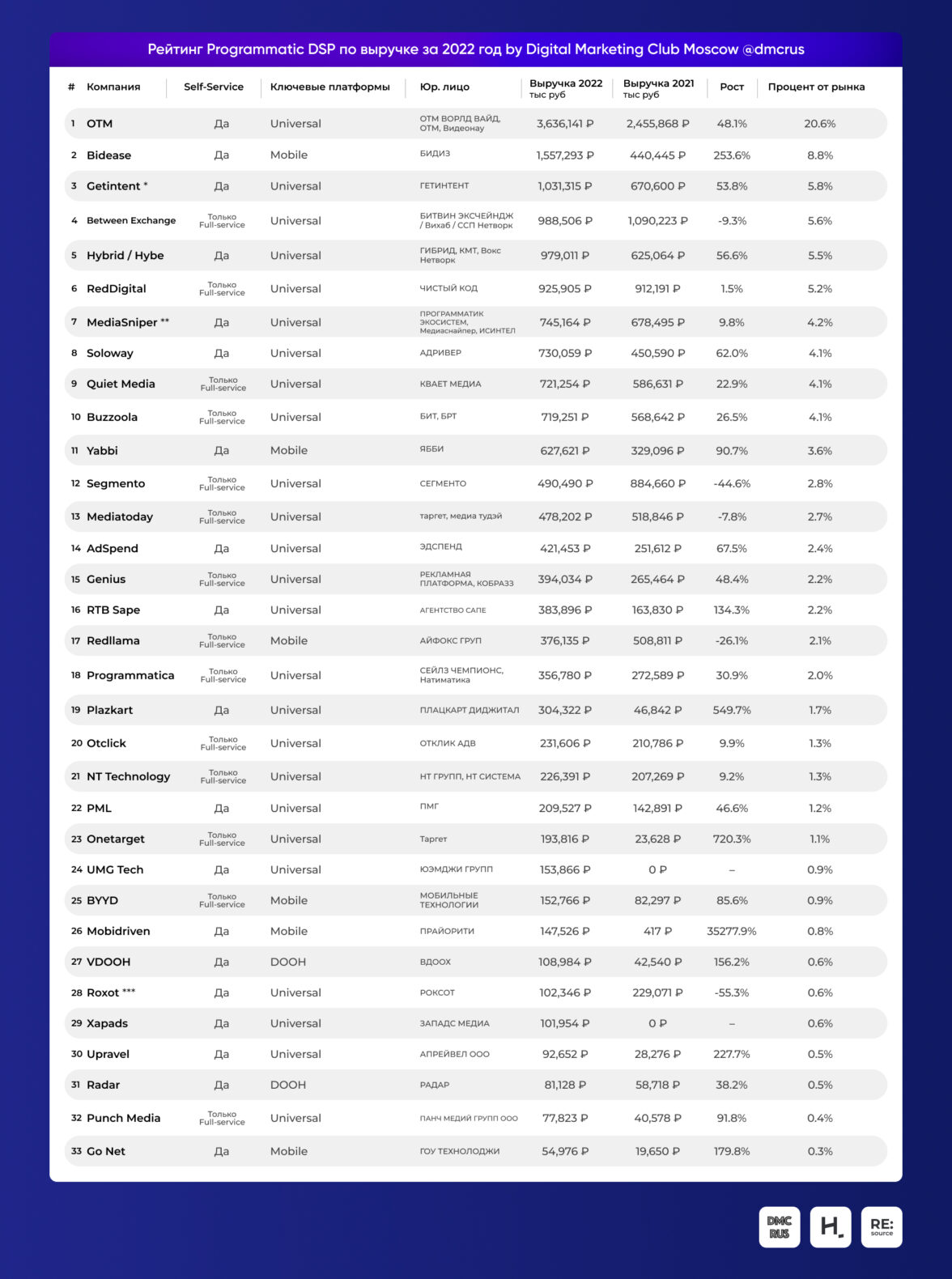 Так как у большинства компаний в рейтинге есть разные продукты и услуги, выделить выручку только от DSP нет возможности. Поэтому рейтинг включает все юр. лица, через которые проходит выручка всех программатик продуктов (DSP, SSP, DMP) компаний.