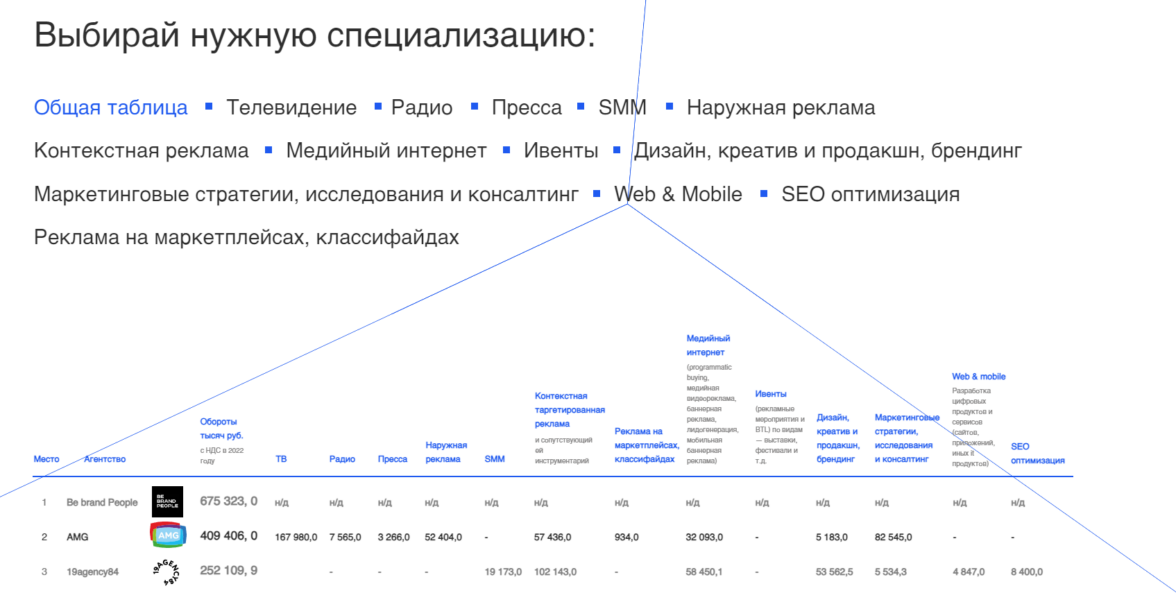 В текущем виде рейтинг стал гораздо удобнее для использования. Сайт позволяет увидеть обороты агентств по разным специализациям: маркетинговые стратегии и исследования, креатив, дизайн и брендинг, ивенты, наружная реклама, SMM, телевидение, пресса, радио, реклама на маркетплейсах и так далее. Всего выделено 13 сегментов.
