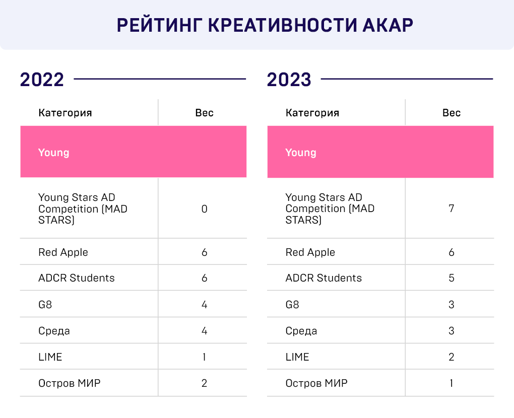 В 2023 году комиссия АКАР по фестивальной и конкурсной деятельности присудила наибольший вес в 7 баллов конкурсу Young Stars AD Competition (MAD STARS). На второй строчке оказался Red Apple с 6 баллами. Замыкает тройку ADCR Students, на его счету 5 баллов.