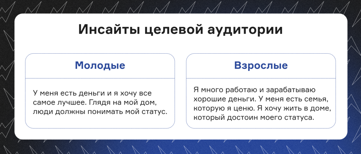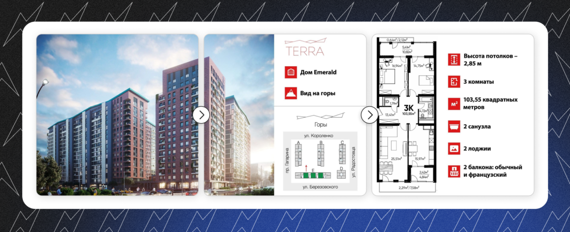 Мы выбрали аудиторию с ключевыми интересами «роскошная недвижимость», «часто путешествуют за границу», «покупка жилья», «недвижимость», «семья и дети», «родители», «инвестиции в недвижимость», «дорогие автомобили». Им показывали объявления с планировками, а затем — промопосты с описанием преимуществ проектов.