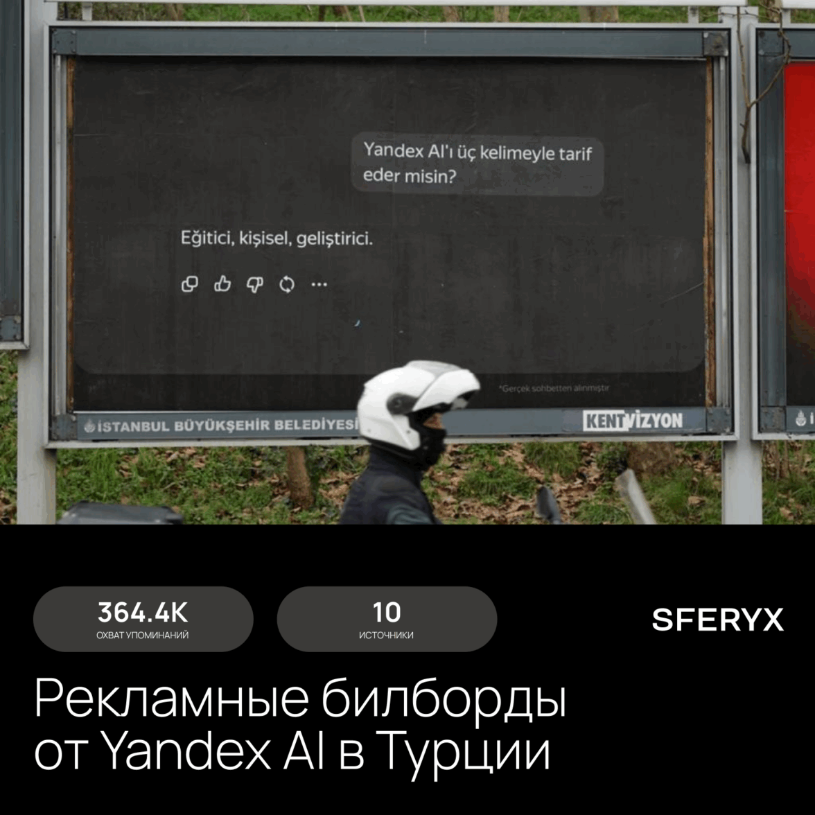 С помощью Sferyx мы нашли и собрали несколько примеров, позволяющих увидеть, как эта тенденция проявляется в реальных кампаниях, которые уже обсуждаются в соцмедиа. Например, Яндекс запустил в Турции серию минималистичных рекламных макетов для Yandex AI в формате простой переписки с нейросетью. Показательно, что на билбордах отсутствует логотип компании, и единственное ее упоминание — в вопросах о том, как Yandex AI облегчает повседневную жизнь, на что ИИ выдает настоящий ответ.
