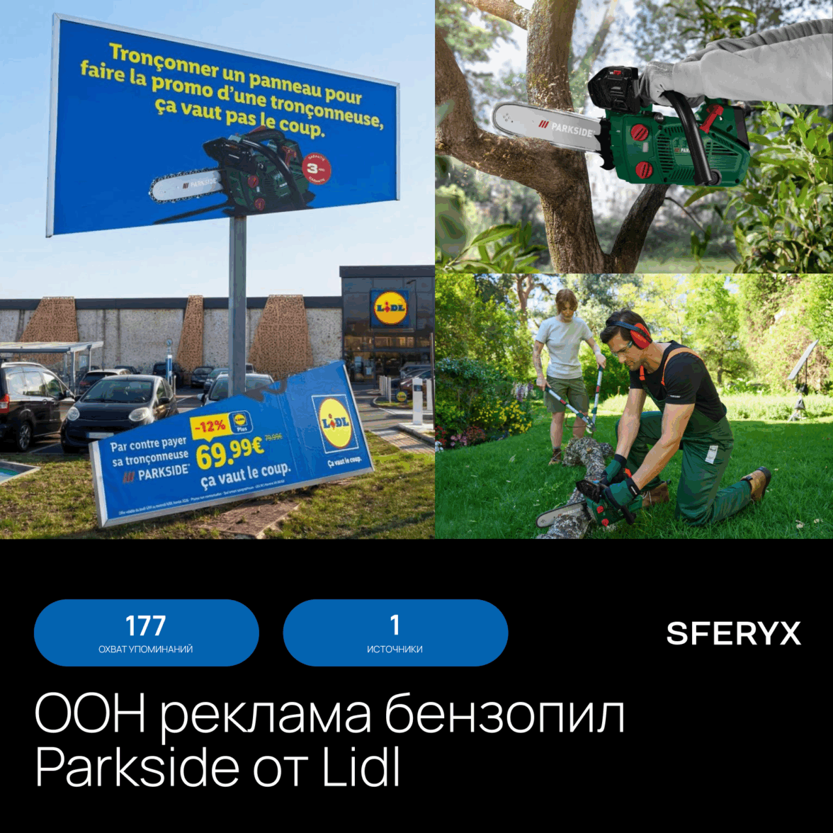 Еще один пример — кейс французского агентства Grinta и ритейлера Lidl. В рекламной кампании в рамках продвижения бюджетных бензопил Parkside функциональность продукта передается через физическое изменение рекламного макета — у билборда буквально отпилена часть конструкции, а на самом щите размещен слоган «Оно того стоит», который противопоставляет высокую стоимость такой сложной инсталляции низкой цене самой бензопилы.