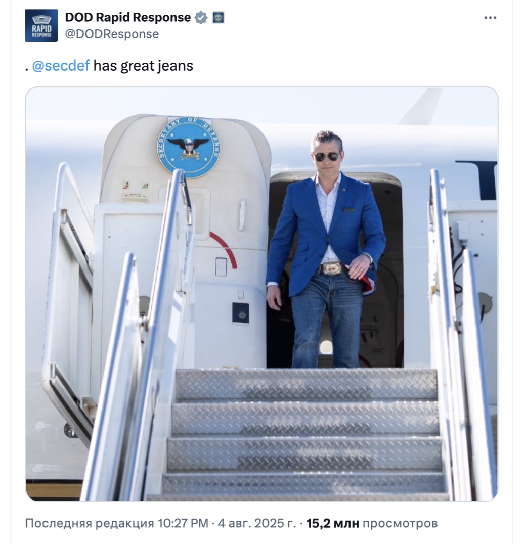 Рекламу джинсов с Сидни Суини одобрило американское руководство. В аккаунте Пентагона в Х появилась фотография министра обороны Пита Хегсета, который в джинсах спускается по трапу самолета. Подпись к фото: «у @secdef отличные джинсы».