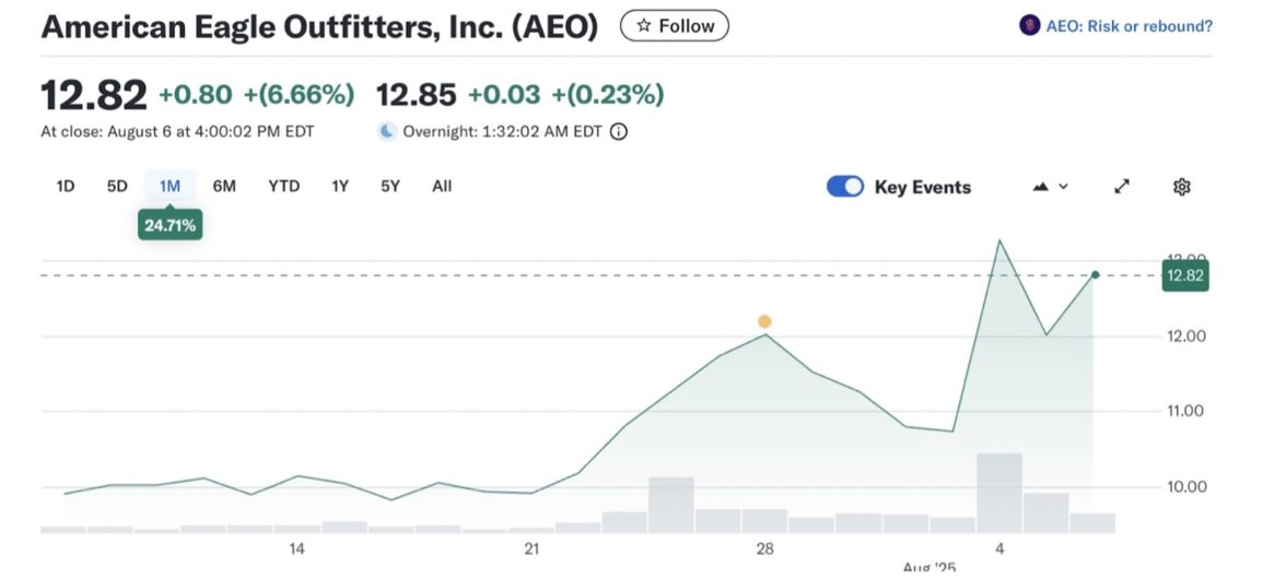 Курс акций American Eagle за последний месяц. Первый скачок произошел после выхода рекламы с Сидни Суини, второй — после заявления Дональда Трампа с одобрением рекламы