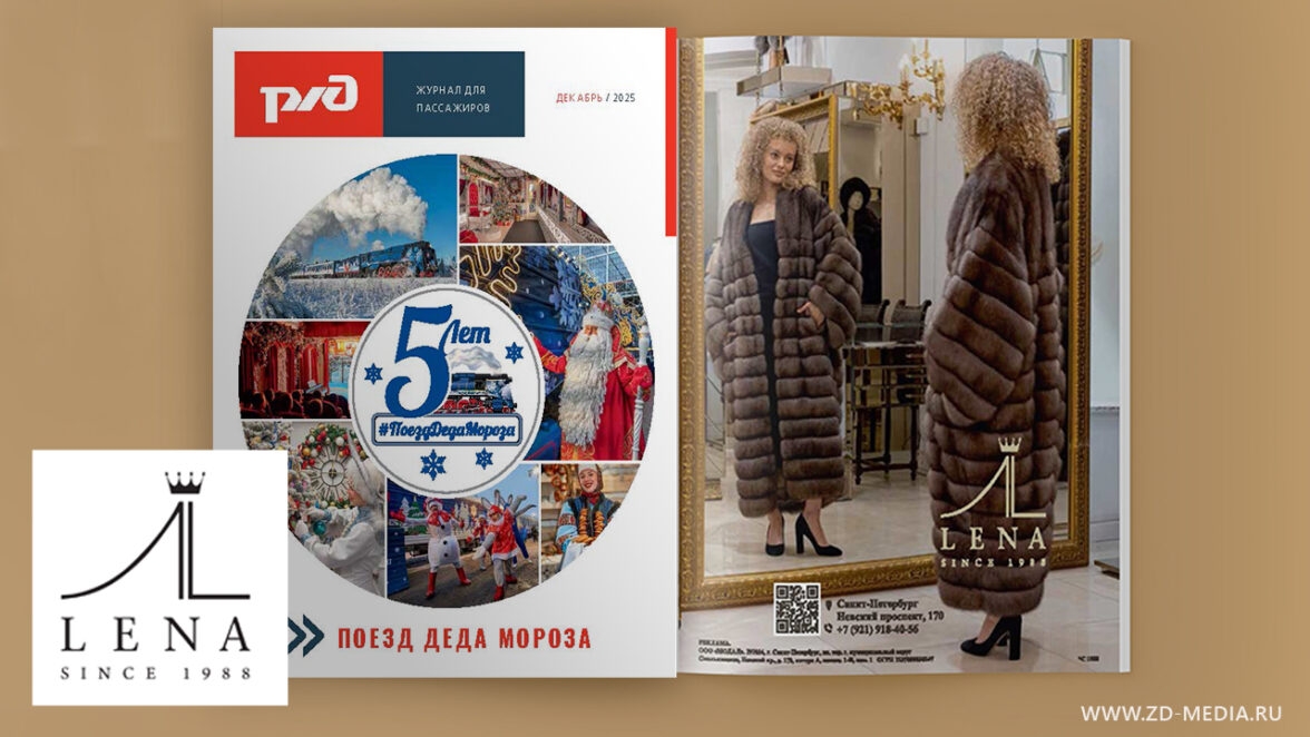 В декабрьском номере бортового журнала «РЖД» разместили имиджевую рекламу меховой компании «LENA» — производителя меховых изделий с уникальным дизайном с 1988 года.