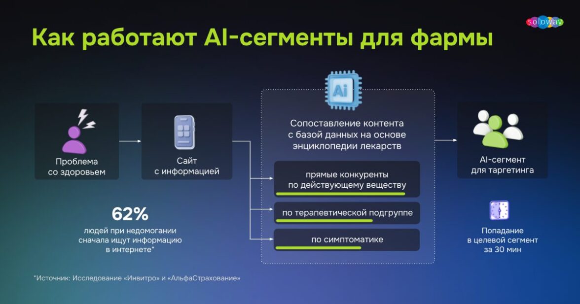 В Soloway искусственный интеллект внедрен в три основных инструмента: AI-сегменты для фармы, инструмент Brand Safety и динамический ретаргетинг.