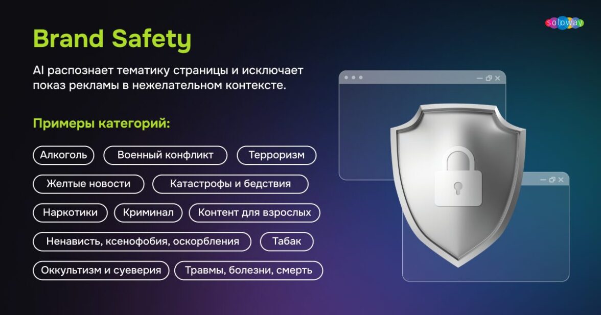 Точечно найти аудиторию и показать ей релевантную рекламу — лишь половина дела. Важно, чтобы эта реклама не показывалась в нежелательном контексте. Soloway решает эту задачу с помощью технологии Brand Safety на базе ИИ.