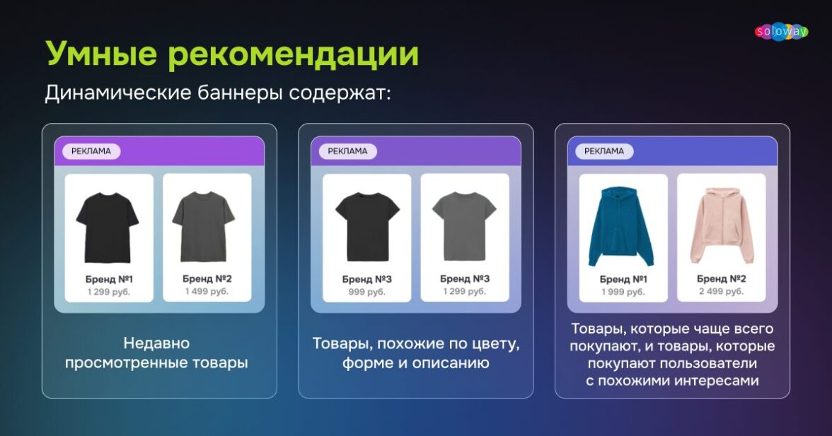 Что делать, когда потенциальный покупатель перешел на сайт рекламодателя, посмотрел конкретный товар, но ушел, так и не купив его? Использовать динамический ретаргетинг — рекламу для тех, кто уже смотрел товары на сайте. Это инструмент Soloway на стыке ML и AI. Он настраивает динамические баннеры, которые адаптируются под каждого пользователя. Система анализирует: