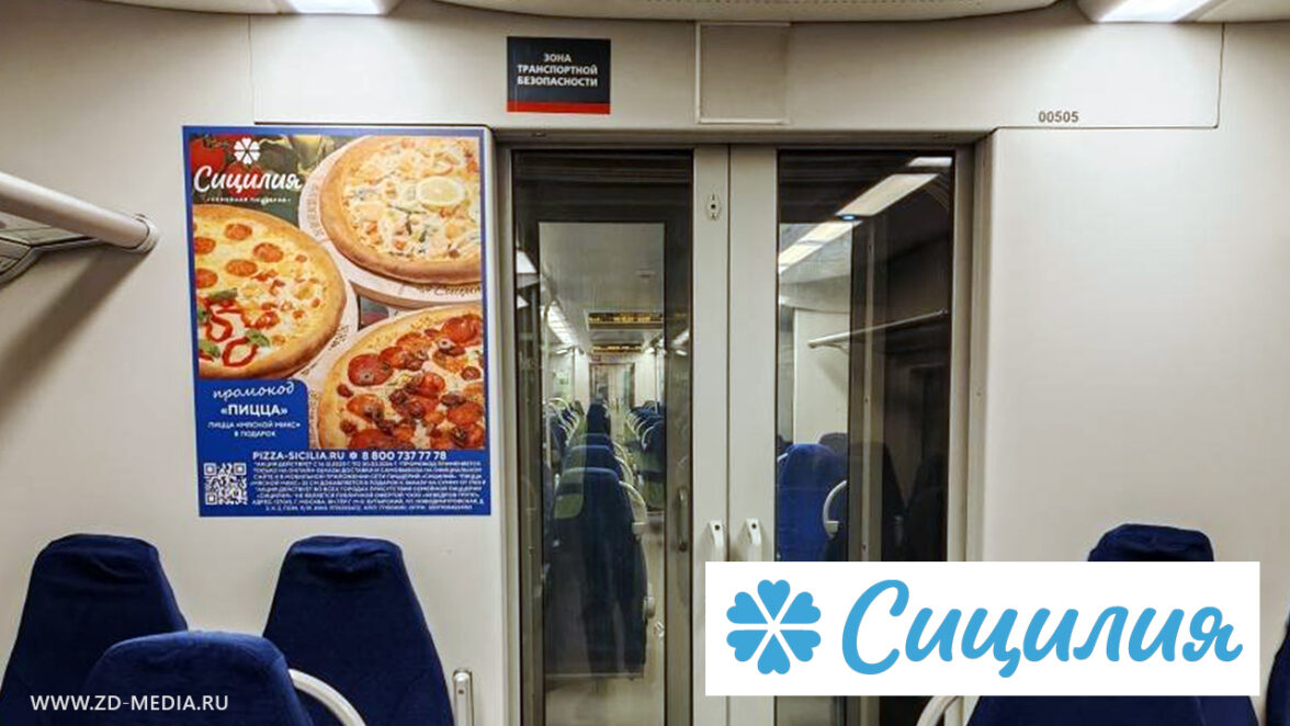 Реклама пиццерии «Сицилия» в поездах Ласточка Сочинского направления
