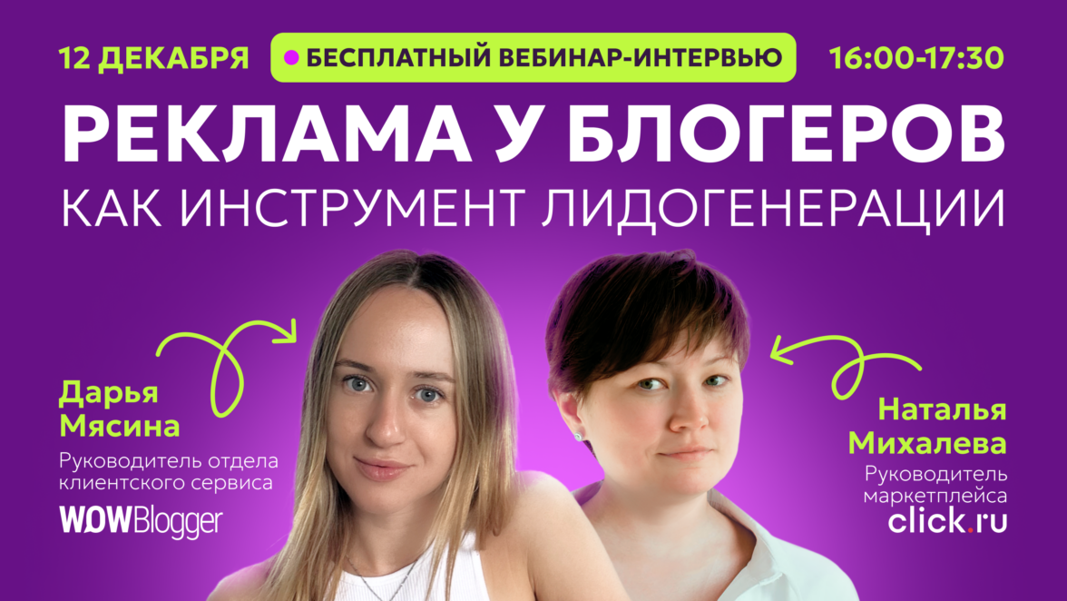 Присоединяйтесь к бесплатному вебинару-интервью «Реклама у блогеров в 2025 году: стратегии запуска, метрики и кейсы», который состоится 12 декабря в 16:00 по МСК.
