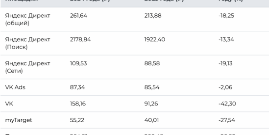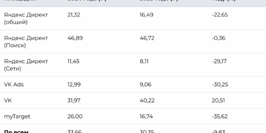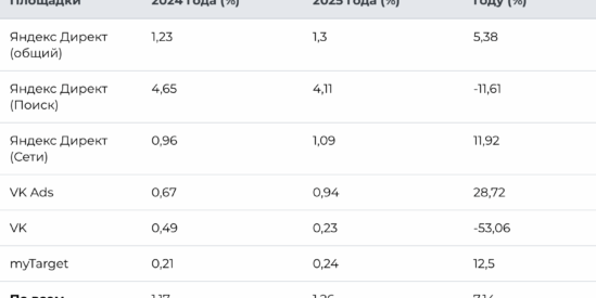 По данным исследования click.ru, во втором квартале 2025 года по сравнению с аналогичным периодом 2024 года стоимость интернет-рекламы на некоторых площадках изменилась следующим образом: