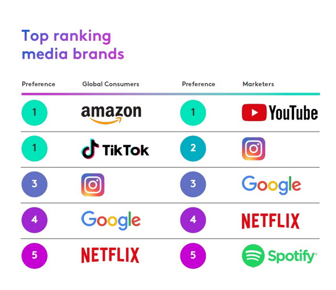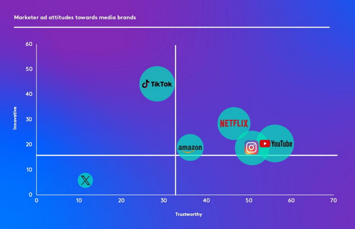 Проведенный Kantar опрос маркетологов показал, что из ведущих медиабрендов наибольшее доверие вызывает YouTube, за ним по убывающей следуют: соцсети Instagram, TikTok и соцсеть Илона Маска X (бывший Twitter), стриминг Netflix и маркетплейс Amazon. Хотя TikTok не очень-то доверяют, его больше всего ценят за инновационность. Наименее инновационным из перечисленных брендов маркетологи признали Х.
