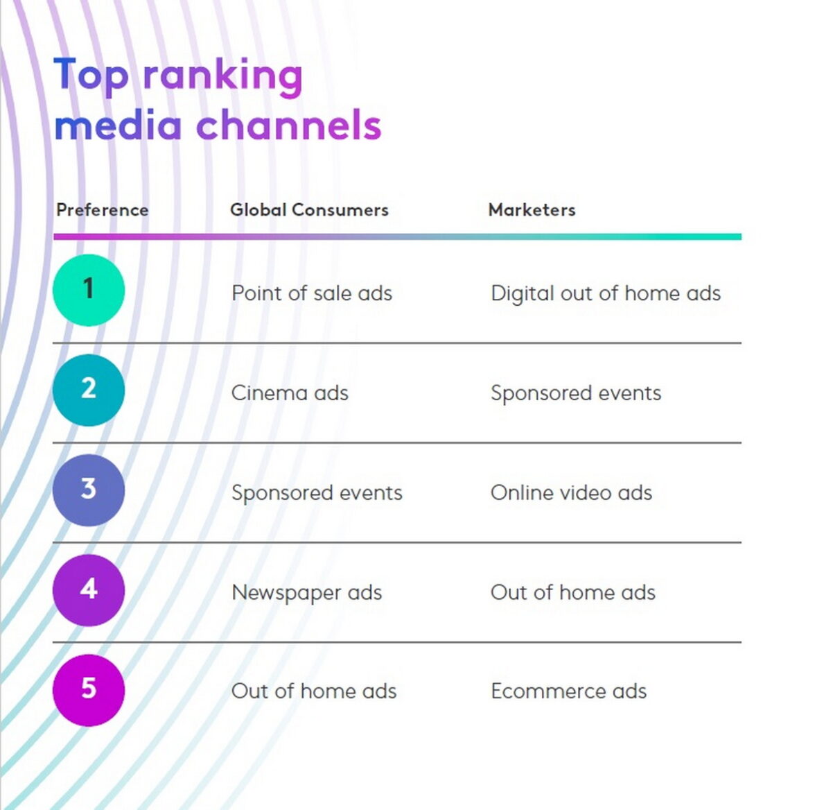 Рэнкинги предпочтений рекламных каналов наглядно демонстрирует разные вкусы маркетологов и потребителей. Потребители на первое место ставят рекламу в точках продаж. У маркетологов она не попадает даже в Топ-5. На втором месте у потребителей — реклама в кинотеатрах. Маркетологи и ее не воспринимают всерьез, равно как и газетную рекламу, занимающую четвертую строчку в потребительском рэнкинге.