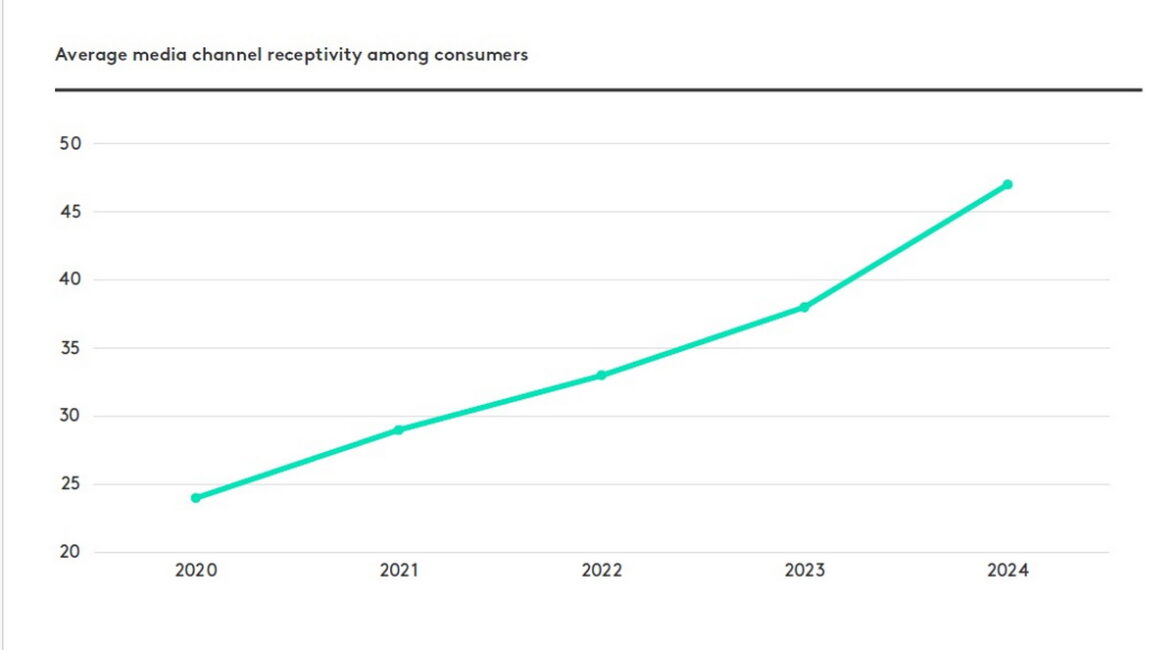 Начнем с хорошей для рекламодателей и участников рекламного рынка новости. В Kantar утверждают, что год от года восприимчивость аудитории к рекламе неуклонно растет. В 2016 году положительные оценки рекламе давали 19% потребителей. В 2020-м, когда Kantar впервые выпустила отчет Media Reactions — уже 24%. С тех пор восприимчивость увеличилась почти в два раза и в 2024 году составила около 47%.