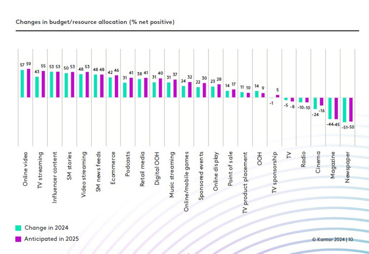 Однако сказанное выше не означает, что маркетологи прислушиваются к мнению потребителей о том, в каком рекламном канале люди хотят видеть рекламу. Авторы исследования пишут, что из сообщений о том, как пересматривались рекламные бюджеты в 2024 году и как планируется их изменить в 2025 году, видно, что более половины маркетологов нацелены на то, чтобы больше денег тратить на интернет-видео, размещение рекламы в стриминговом ТВ, создаваемый блогерами контент и истории в соцсетях. Одновременно будут снижаться расходы на рекламу на эфирном и кабельном ТВ, на радио, в кинотеатрах, газетах и журналах. При этом они подчеркивают, что многие традиционные медиа превратились в онлайн-бренды. Сайты ведущих телекомпаний, газет и журналов не менее, а часто даже более популярны, чем эфирный или бумажный контент, созданный той же структурой.