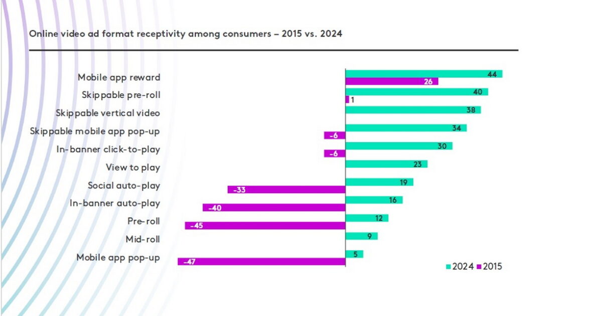 Сильнее всего заметны перемены в отношении к рекламным окнам, всплывающим в мобильных приложениях: показатель восприимчивости к рекламе вырос с отрицательной отметки в -47% в 2015 году до +5% в 2024-м. Восприимчивость к рекламным роликам, которые загружаются до показа основного видеоконтента (pre-roll), выросла за тот же период с -45% до +12%. C отрицательного на положительное изменилось и отношение к автозапуску рекламы — хоть в браузере, хоть в соцсети.