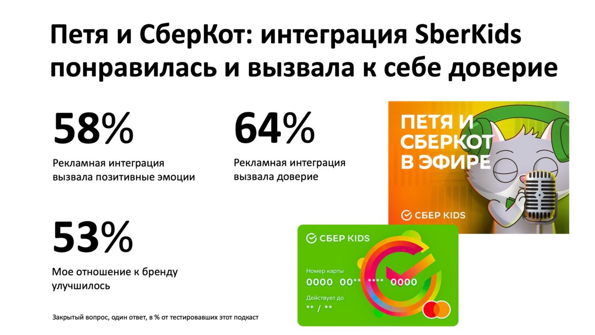 Так, оценочное исследование показало, что контент вызвал интерес: 61% респондентов подкасты понравились, а 54% хотели бы узнать больше о том, что рассказывается в аудиозаписи. У большинства после трансляции отношение к рекламируемым брендам улучшилось. Например, у 58% слушателей подкаста «Петя и Сберкот» реклама SberKids вызвала позитивные эмоции, а у 64% рекламная интеграция вызвала доверие. Похожие цифры были получены и по двум другим проектам ГПМ Радио.