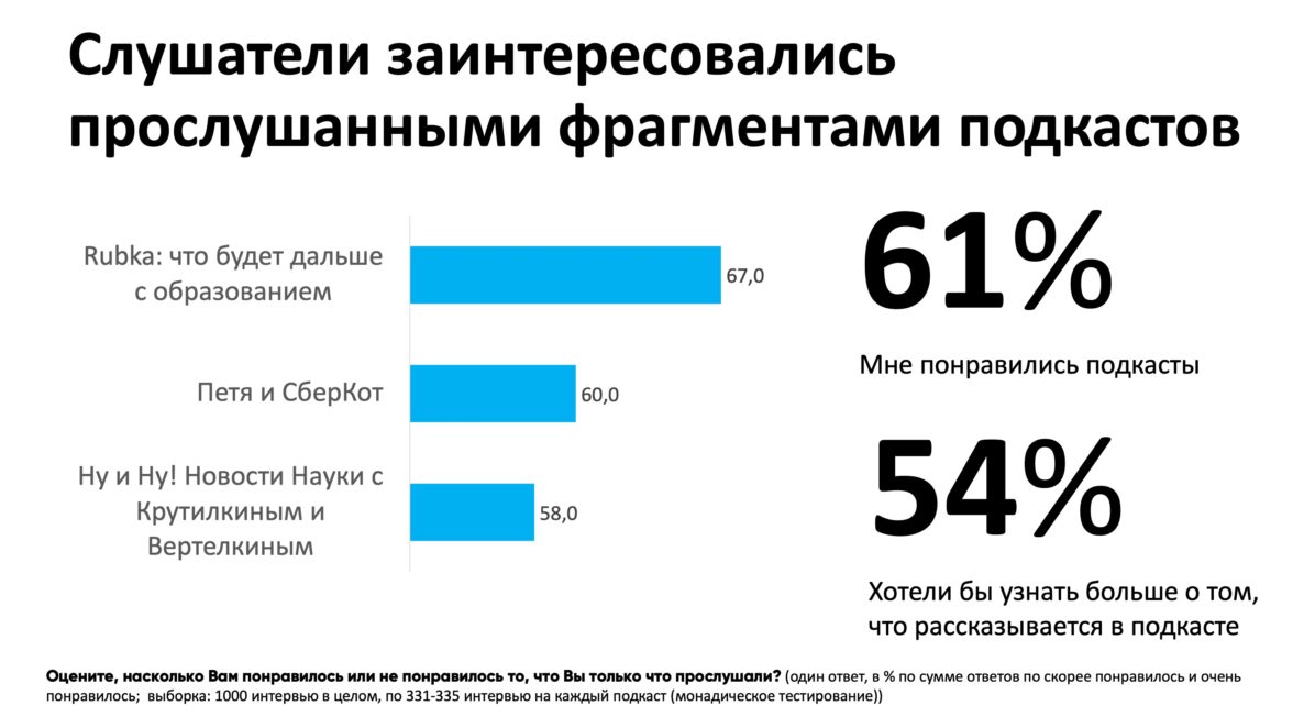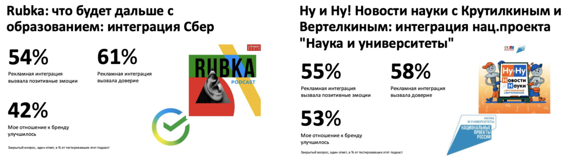 В рамках исследования слушателям также было предложено прослушать фрагменты подкастов компании ГПМ Радио (входит в холдинг «Газпром-медиа»), чтобы оценить, насколько та или иная рекламная интеграция привлекает внимание аудитории. Среди предложенных проектов: подкаст Rubka от команды Сomedy Radio, где в одном из выпусков про образование был интегрирован образовательный кредит от Сбербанка. Также в исследование вошли бренд-подкасты – оригинальные шоу, которые созданы по заказу рекламодателя: это реализованный Сбербанком совместно с Детским радио подкаст «Петя и Сберкот»; и еще один клиентский подкаст от Детского радио — «Ну и Ну! Новости науки с Крутилкиным и Вертелкиным» – с интеграцией Национального проекта «Наука и университеты». На примере этих проектов удалось выяснить, что слушатели более лояльно относятся к рекламе, которая идет наряду с качественным контентом.