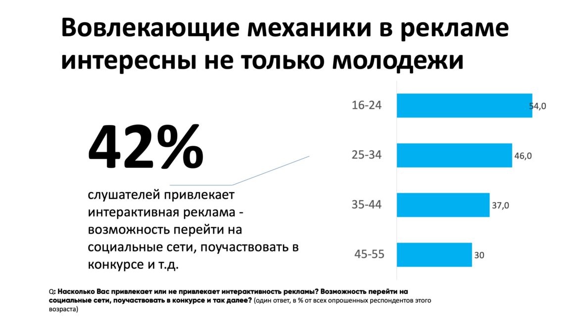 Вовлекающие механики в рекламе интересны не только молодежи. Интерактивная реклама в подкастах (голосовые интеграции с предложением перейти на социальные сети, поучаствовать в конкурсе и т.д.) является привлекательной для 42% аудитории. Наиболее активно на нее откликаются слушатели в возрастных категориях от 16 до 24 лет и от 25 до 34 лет – 54% и 46%, соответственно. У более старшей аудитории данные показатели закономерно снижаются: интерактивной рекламе высказали предпочтение 37% участников исследования в возрасте от 35 до 44 лет и 30% — от 45 до 55 лет.