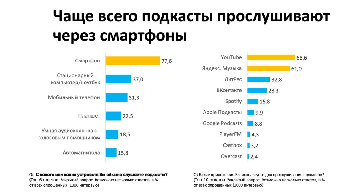 Для детального анализа основных трендов использованы данные репрезентативного онлайн-опроса среди мужчин и женщин от 16 до 55 лет, которые слушают подкасты не реже, чем раз в месяц. Проведено 1000 интервью в городах России с населением свыше 100 тыс. человек. Главная цель исследования — оценить отношение аудитории к рекламе в подкастах и в умных колонках. Респондентам были заданы вопросы о регулярности и месте прослушивания подкастов, выборе устройств и приложений и другие вопросы, в том числе, связанные с отношением к рекламе в подкастах. Согласно полученным данным, чаще всего подкасты прослушивают через смартфоны — так ответили 77,6% опрошенных, умную колонку с голосовым помощником отметили только 18,5% участников опроса, а также среди выбранных устройств фигурировали стационарный компьютер/ноутбук (37%), мобильный телефон (31,3%), планшет (22,5%), автомагнитола (15,8%). А самые популярные приложения для прослушивания подкастов YouTube (68,6%) и Яндекс. Музыка (61%).