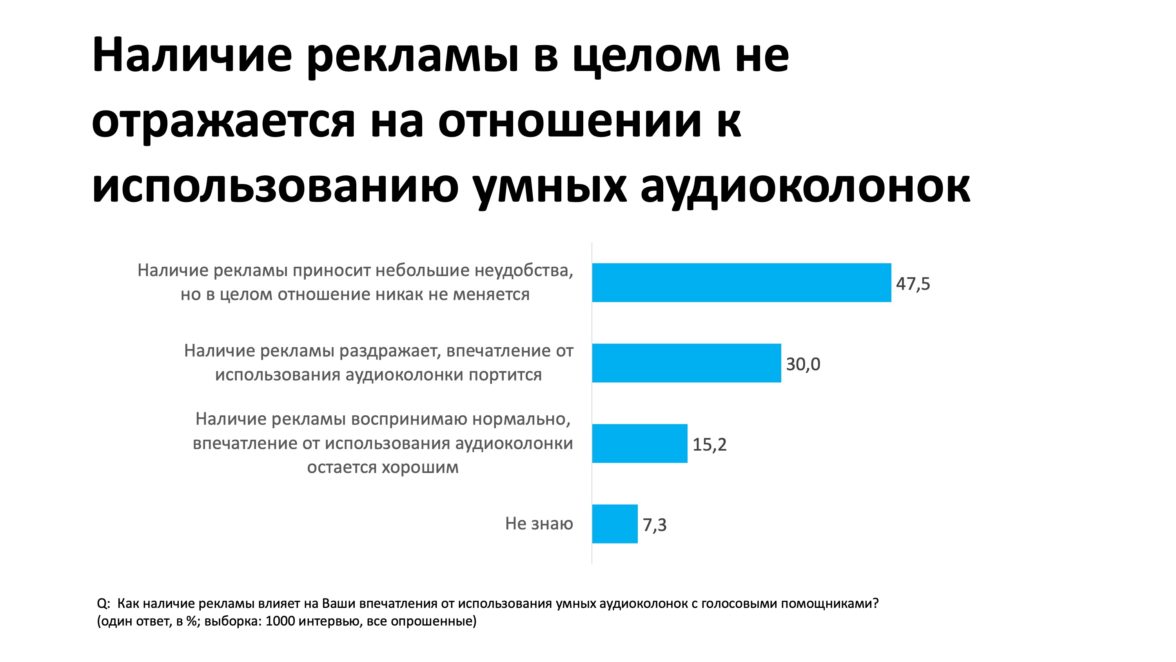 Отношение к рекламе в умных колонках нейтральное. 47,5% участников опроса отметили, что наличие рекламы при использовании умных аудиоколонок с голосовым помощником в целом не отражается на отношении к использованию этих девайсов. Еще 15% воспринимают рекламу нормально, она не портит впечатление от использования аудиоколонки. В то же время показатели по заметности рекламы в умных колонках несколько ниже, чем у подкастов в целом: при их использовании ее замечают только 55% слушателей, когда-либо пользовавшимися умными аудиоколонками с голосовыми помощниками.