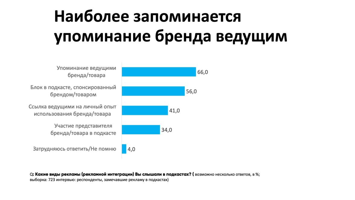 Лучше всего запоминается упоминание бренда ведущим. 66% замечавших рекламу в подкастах отметили, что слышали название торговой марки или товара во время трансляции, более половины (56%) заметили спонсорский блок в подкасте. 46% участников исследования отметили, что упоминание бренда ведущим или ссылка ведущего на личный опыт пользования продуктом не отвлекает их от прослушивания, а 42% слушателей доверяют его словам о личном опыте использования товара.