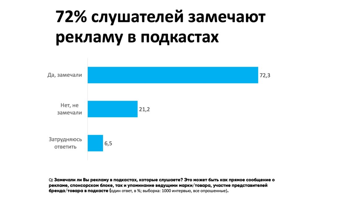Востребованность данной коммуникации у российской аудитории подтвердили и результаты исследования Tiburon Research для сейлз-хауса «Газпром-медиа». Согласно полученным данным подкасты являются перспективным маркетинговым инструментом – 72% активных слушателей подкастов их замечают, а наиболее эффективной коммуникацией считается упоминание брендов ведущими — 66% опрошенных вспомнили о таком формате. Также исследование выявило, что аудитория готова к наличию рекламы в подкастах: в основном, реклама не вызывает раздражения у слушателей и не оказывает негативного влияния на прослушивание подкаста.Эксперты пришли к выводу, что подкасты могут влиять на формирование лояльности аудитории, работать на знание бренда и, благодаря высокой вовлеченности и доверию ведущим подкаста, позволяют более полно взаимодействовать с продуктом.