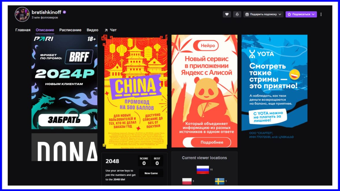 Контент: реклама курсов по программированию, дизайну, киберспорту и другим навыкам, которые могут заинтересовать аудиторию Twitch*.