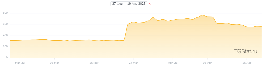 Сверху — рост подписчиков, снизу — охватов, за 2 месяца продвижения (март-апрель). Мы добились существенного увеличения живых и «горячих» подписчиков из Telegram Ads и с посевов