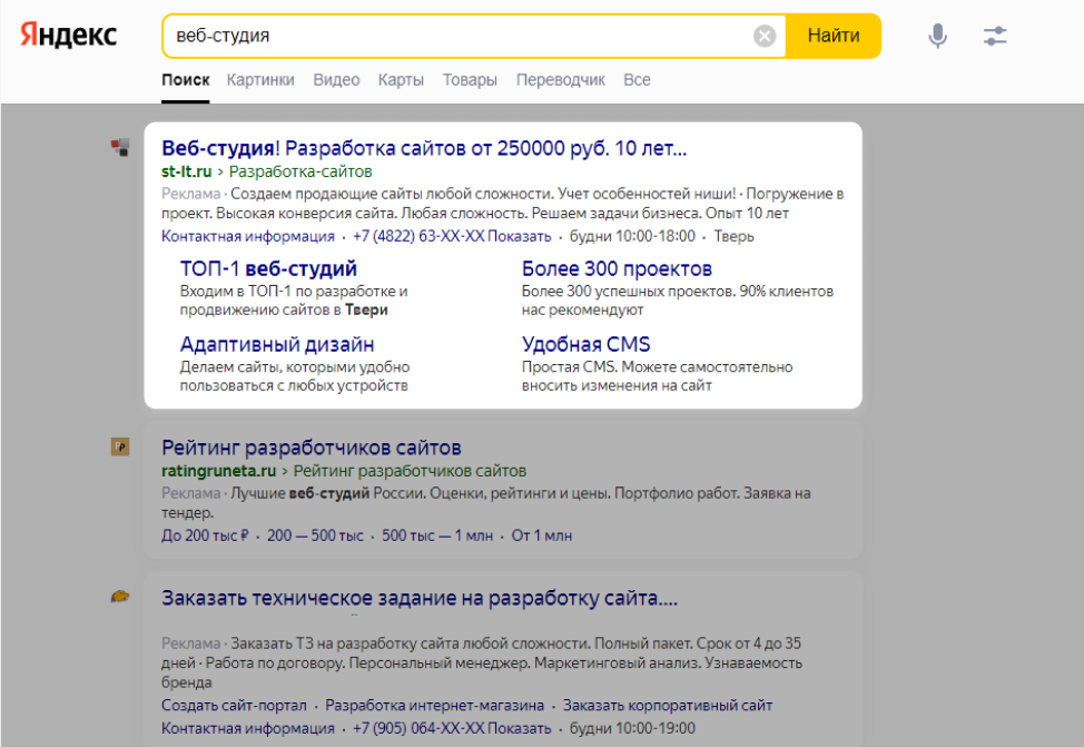 Эти рекламные объявления состоят из заголовка, описания и ссылки на сайт компании-рекламодателя. Также предусмотрены расширения объявлений (адрес, телефон, ссылки на сайт рекламодателя, спецпредложения и прочее), и реже — изображения продукта. Они привлекают внимание и в идеале повышают кликабельность.