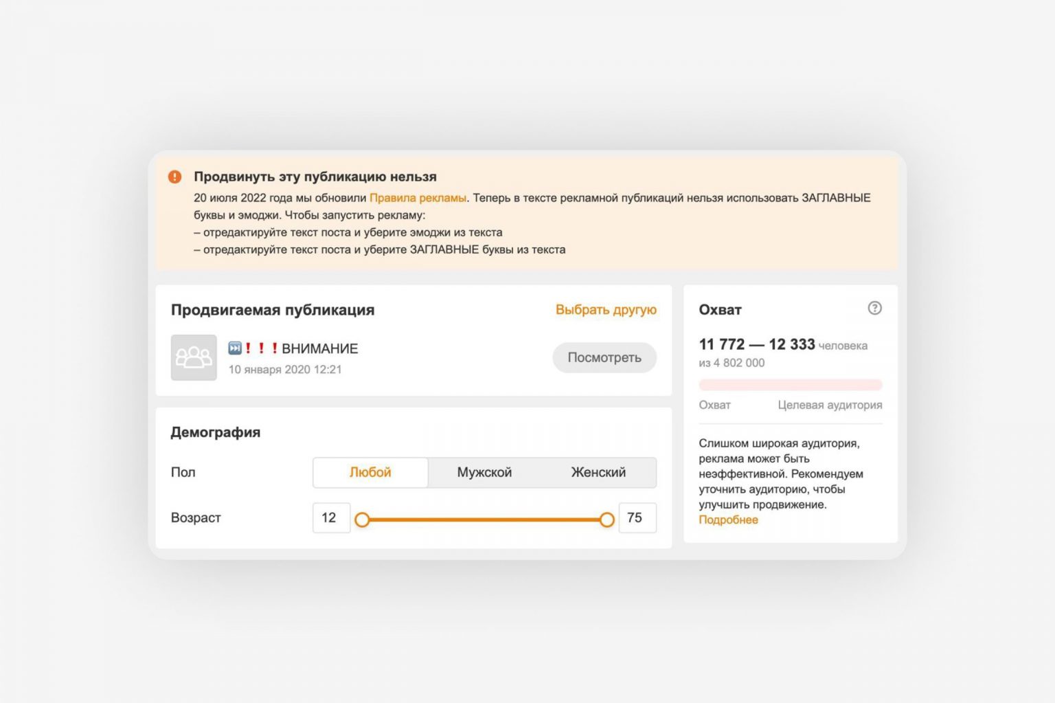 — с 20 июля в рекламных кампаниях нельзя использовать эмодзи и слова, состоящие только из заглавных букв. Исключения будет сделано только для зарегистрированных товарных знаков и общепринятых аббревиатур. Ранее запущенные кампании будут работать без изменений до окончания срока размещения;