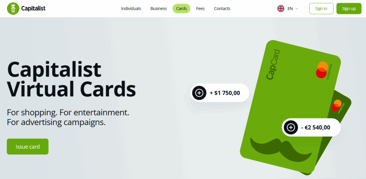 Один из старейших сервисов на рынке. Работает много лет, имеет репутацию. Поддержка международных мерчантов широкая — карты принимают почти везде. Где оформить виртуальную карту для рекламы с гарантией стабильности — многие выбирают именно Capitalist.