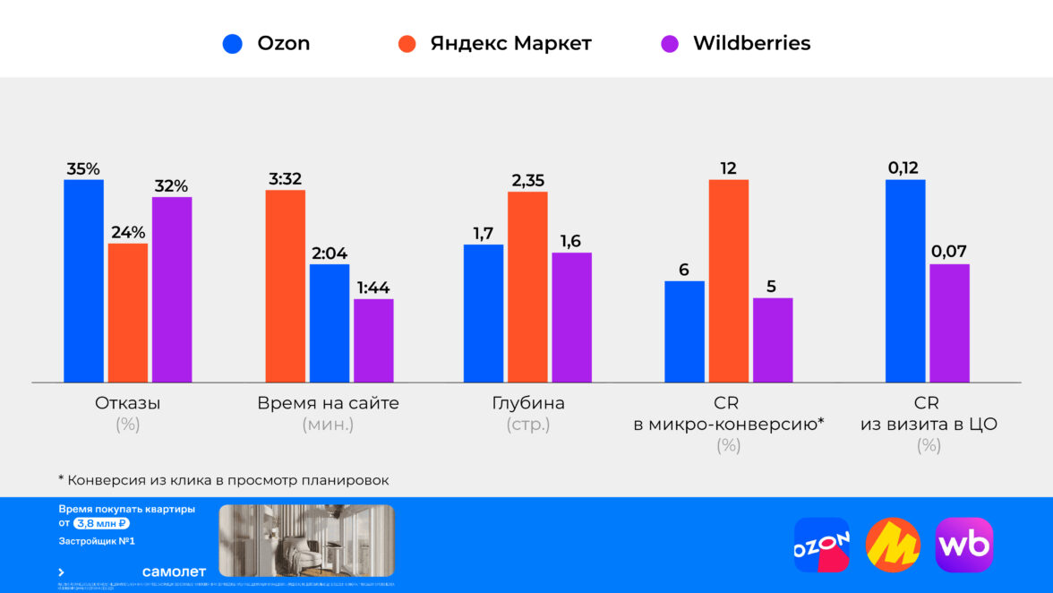 По основным показателям на сайте наиболее эффективен «Яндекс Маркет»: показатель отказов значительно ниже, чем у других площадок (24%), время на сайте — выше (3:32), а конверсия в просмотр планировок составляет 12%. Ozon и Wildberries схожи по показателям.